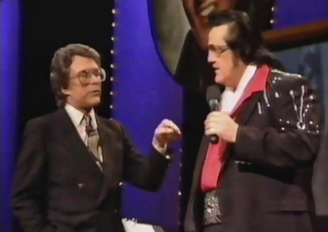 In this screen capture from a documentary narrated by actor Bill Bixby, he debates the case (with Elvis impersonator Johnny Harra) that Elvis faked his death in 1977 and could still be alive…