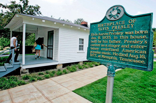 Fans walk into the small home where Elvis was born in Tupelo, Mississippi. The two-room shack is still there. The East Heights Garden Club looks after it. They make sure the grass is mowed and the bushes are trimmed and the paint job is respectable. They open the door for a few hours each afternoon, and you can walk through the tiny rooms for a quarter.