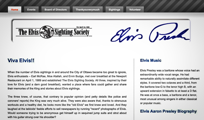 The Elvis Sighting Society — whose central tenet is that The King is alive and well — has a revolving membership and a very haphazard meeting schedule, which is mostly concerned with fundraising activities for community causes in Ottawa, Canada, where it was founded.