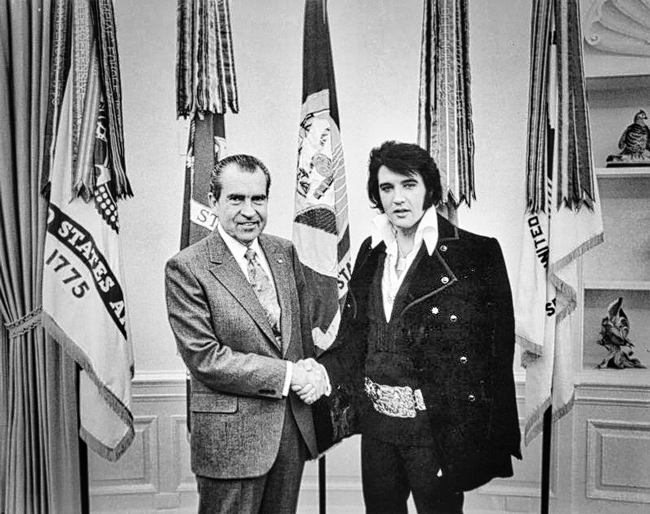 When this famous photo of Elvis and President Nixon was taken, both men were at the top of their careers. Presley was in the middle of a successful comeback, selling out shows in Las Vegas. He'd just been nominated one of the country’s Ten Outstanding Young Men by the U.S. Junior Chamber — it was recognition he was proud to receive. Nixon, meanwhile, had not yet been tainted by Watergate, and was riding a wave of popularity for vowing to get America out of Vietnam and desegregate the nation's schools.
