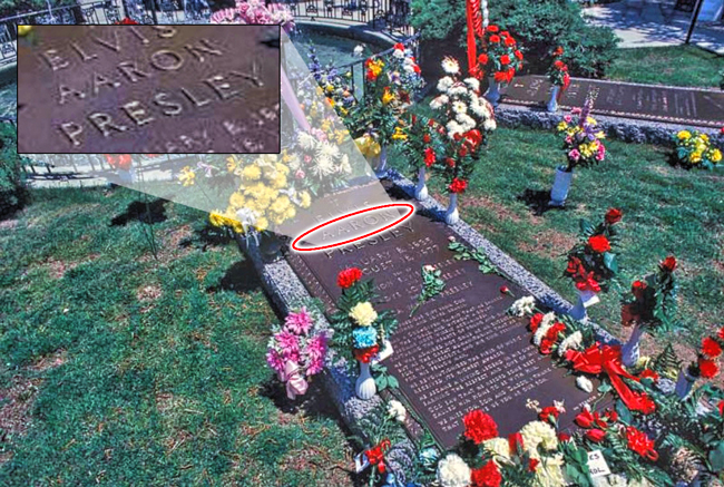 On Presley’s gravestone, his middle name Aron is spelt Aaron. Although Aaron is Elvis’ genuine middle name — allegedly either his parents or he wished to change it to Aron, as a possible tribute to Presley’s stillborn twin, Jesse Garon Presley; but some fans believe the misspelling served another purpose, as a subtle hint to those in the know that Elvis faked his own death.
