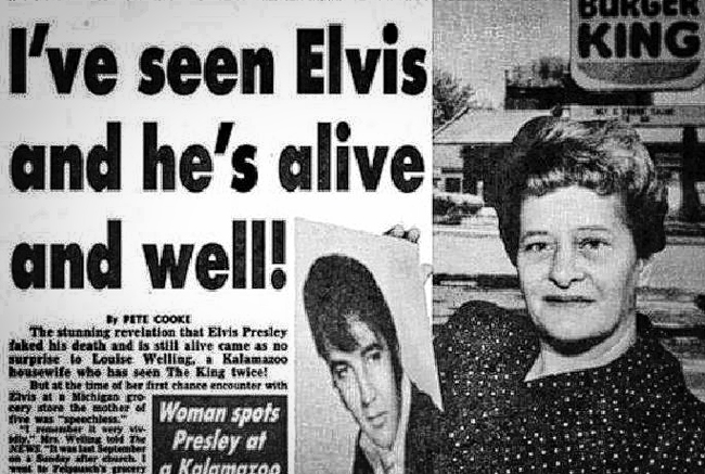"Woman spots Presley at a Kalamazoo Burger King" … The stunning revelation, that Elvis faked his death and is still alive, came as no surprise to Louise Welling, a Kalamazoo housewife who said she saw The King twice, at a Kalamazoo Burger King on 760 W. Michigan Avenue. In her defense,