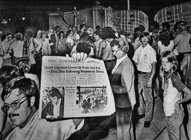 A man outside the gates of Graceland holds up a newspaper announcing Elvis' death. Mourners stayed all night outside the singer's mansion.
