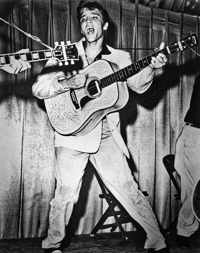 Elvis Presley performs in 1956 in a photo that was used for his first RCA Victor album cover.