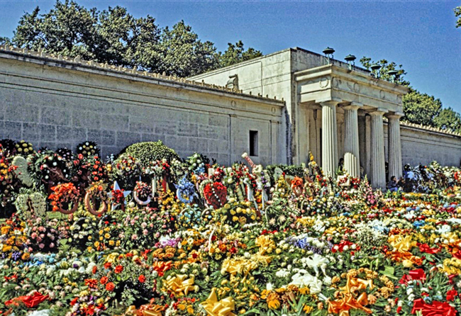 Flowers are piled up outside the mausoleum at the Forest Hills Cemetery in Memphis ahead of Elvis's burial.