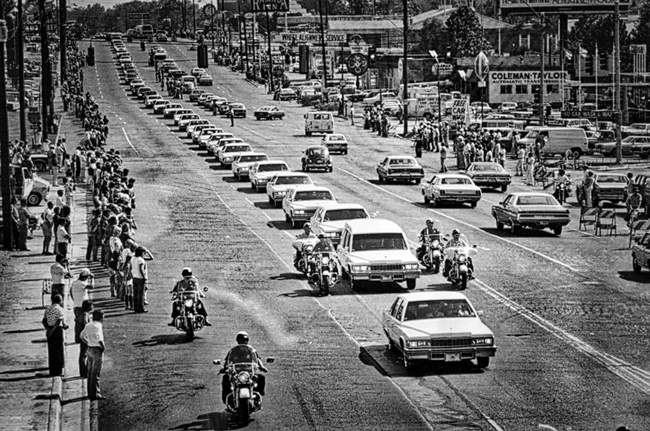 The hearse carrying Elvis drives along Elvis Presley Boulevard on the way to Forest Hills Cemetery.
