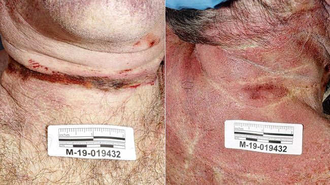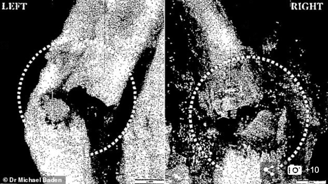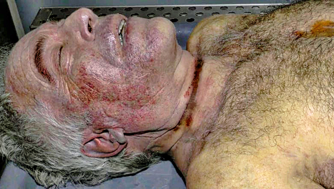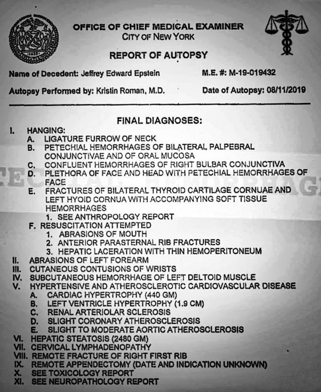 On October 30, 2019, Michael Baden issued a report in which he said that Epstein's neck injuries were much more consistent with "homicidal strangulation" than suicide. He wrote that Epstein "had two fractures on the left and right sides of his larynx, specifically the thyroid cartilage or Adam's apple, as well as one fracture on the left hyoid bone above the Adam's apple". In particular, the hyoid bone, which is rarely broken in suicidal hangings, was broken in a way indicative of strangulation from behind. Baden later said, "Going over a thousand jail hangings, [and] suicides in the New York City state prisons over the past 40-50 years, no one had three fractures." Epstein's neck wound was in the center of his neck, not under his mandibles as in a typical hanging. Baden points to this as being more common when a victim is strangled by a wire or cord. Baden also observed that the wound is much thinner than the strip of bedsheet was, and although there was blood on Epstein's neck, it was absent on the bed-sheet ligature. According to the autopsy files, Epstein also had contusions on both of his wrists, an abrasion on his left forearm, and deep muscle hemorrhaging of his left deltoid or shoulder. His brother Mark later suggested that he was "handcuffed and struggled." Epstein also had hemorrhages in his eyes, which although not unheard of in hangings, are more common in strangulations.