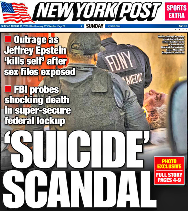 On August 10, 2019, Jeffrey Epstein was found unresponsive in his jail cell. According to an official FBI statement, "He was transported to a local hospital for treatment of life-threatening injuries and subsequently pronounced dead by hospital staff."