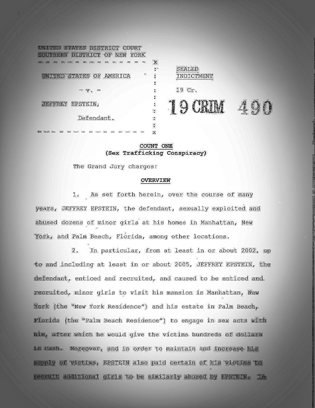 On July 8, prosecutors with the Public Corruption Unit of the Southern District of New York charged him with sex trafficking and conspiracy to traffic minors for sex. The grand jury indictment alleged that "dozens" of underage girls were brought into Epstein's mansions for sexual encounters.