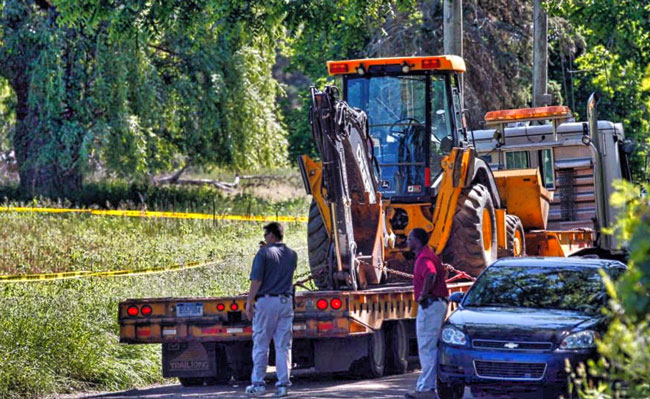 Federal investigators stand next to heavy equipment by a field which they're prepared to dig up for the remains of Jimmy Hoffa in Oakland Township, Michigan, on June 17, 2013. Their efforts were fruitless.