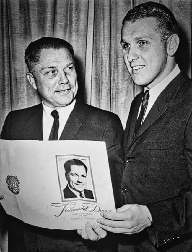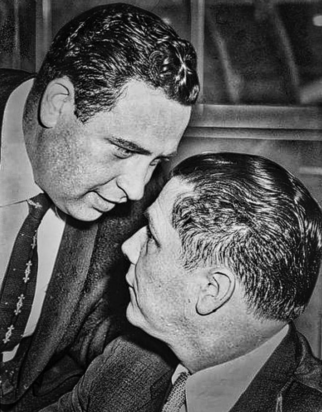 Bernard Spindel and Jimmy Hoffa after a 1957 court session in which they pled not guilty to illegal wiretap charges. Spindel was a surveillance, wiretapping, electronics and lock-picking expert. A 1966 article in Life magazine called him the "No. 1 big-league freelance eavesdropper and wiretapper in the U.S."