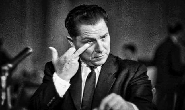Hoffa flips off attorney Robert Kennedy during a Senate committee hearing in 1957.