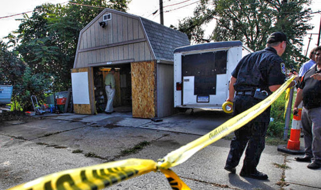 Police tape blocks a driveway where authorities drilled for soil samples in the floor of a shed at a Roseville, Michigan home on September 28, 2012. Police have been told by a source that Jimmy Hoffa may be buried beneath a driveway.