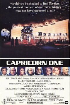 So anyway, to wrap everything up: Capricorn One is a great sci-fi premise spoiled by bad execution. Since Hollywood is creatively exhausted and slavishly remaking or rebooting everything in sight, may I suggest they have another go at this one? On second thought, maybe not. They'd probably give the project to Michael Bay, and he'd give us a bombastic monstrosity that leaves us longing for the artistic excellence of the original. BACK TO: Movie CoverUps Index * Specials * Main Index Content Copyright © 1996 to by The Web Network Inc HauntedHouses.com * HistoricClub.com * MurderMysteries.com> |