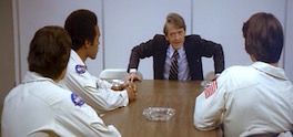 When the assignment to review Capricorn One first came my way, I was apprehensive. I have vague memories of Capricorn One from the late '70s, when I saw it, once, in the theater. That fact is key. Back then if I liked a movie, I saw it over and over and over again. If I look back on the blockbusters from that now-distant decade — The Towering Inferno, Jaws, Star Wars, and the like — I saw them all an absurd number of times. Not Capricorn One. Once was enough. Why? For the obvious reason, of course — it was a disappointing movie. Not technically, in terms of look, or acting, or sets and such. I'm talking about the nuts and bolts of the story. I loved the idea of it — a faked Mars landing. Oh goody! A giant, audacious, high-tech hoax! But the devil's in the details, as always, and Capricorn's writer-director, Peter Hyams, really kinda blew it in the scenario department. Right before hitting "Play" on the blu-ray player, I entertained a modest sense of hope that my memory of disappointment was somehow ill-founded. Maybe, I thought, the movie was better than I remembered. Maybe it had aged well. Maybe I was being needlessly pessimistic, and I would find myself pleasantly surprised as the story unfolded. But within minutes of the truly striking opening images of a rocket launch pad stunningly backlit by a morning sunrise, the dismal truth about Capricorn One came flooding back. It just isn't that good a movie. The best thing about it is the premise, but once you dive into the nitty-gritty of the plot, dammit, it simply falls to pieces. Not that there aren't bright spots and pleasurable moments and even some well-done scenes — there are. But this is basically Grade B film making, at best — and a massive missed opportunity for a genre classic. Here's the thing about conspiracies: the bigger they are, the less plausible they get. Even back in a world without the Internet or social media, the laws that govern people in groups plotting evil deeds are pretty unforgiving: the temptation to spill the beans is constant and corrosive to the ongoing success of the enterprise. As the number of people in on a scam rises, so does the temptation to reveal it. If what I'll call the "juiciness quotient" of the scam goes up, so does the temptation to reveal it. Every conspiracy movie — and every real-life conspiracy — faces this obstacle. All of which makes a faked Mars landing one hell of a challenge for the writer. When you think about the expense and national prestige of space missions in general, the public scrutiny, and the number of people who are necessarily "in the know" on the operational details, to say nothing of the basic juiciness quotient of faking something of this magnitude — well, you're setting yourself one mighty high story-telling bar. The conspiracy — and the plot problems — kick in early, when the astronauts are pulled out of the capsule minutes before launch. Earth to Peter Hyams: wouldn't everyone see that? There are some things so obvious you'd think the writer would see them coming. We're asked to believe you can extract three astronauts from a Saturn 5 rocket in the middle of a public launch, with news cameras everywhere and spectators watching with binoculars in the stands — and nobody notices? Really? Hal Holbrook as the villainous NASA administrator Dr. James Kelloway is one of the main attractions and pleasures of Capricorn One. Hyams hit it on the nose when he made Kelloway the focus of the conspiracy, and Holbrook was a great choice to play him. If such a scam ever got off the ground, it would have to be the brainchild of someone like this — someone ambitious, powerful, and technically accomplished — and fairly high up the organizational ladder. In one of the film's best scenes, he lays it out for the astronauts after they've been spirited away from the launch that the mission was doomed to fail, that a corrupt subcontractor cut corners on the life-support system and NASA didn't find out 'til it was too late that it would've killed them all halfway to the red planet. And yet... I still think in a real conspiracy this fact would've been kept from the astronauts; there would be no reason ever to tell them. It could be revealed to the audience later in the story. Nevertheless, the technical gremlin Hyams delivers to serve as the grain of sand at the heart of the conspiracy pearl is a good one. The astronauts are played by James Brolin, Sam Waterston and O.J. Simpson. As the kind of alpha-male type who would lead a space mission, Brolin is just so-so. He looks the part, but his acting is wooden and uninspired. As the wise-cracking second-in-command Peter Willis, Sam Waterston has all the best lines in this movie, many of them laugh-out-loud funny. As for O.J., it's impossible to see him in anything without thinking about you-know-what, but even taking that into account I still far prefer him in any of the Naked Gun flicks over what he does here. Heck, I think he was better in The Towering Inferno. The best I can say for his acting in Capricorn One is that I'm glad he doesn't have more dialog — and he doesn't have much. Things that worked: