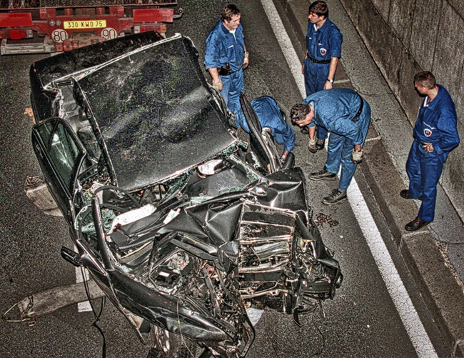 Paul veered the Mercedes to the right to pass the car ahead of him in the left lane. But then he lost control, and the right rear of the Mercedes swerved into the right wall of the tunnel with a loud crash. Attempting a high-speed correction, Paul turned sharply left — and the Mercedes veered into one of the concrete pillars separating the lanes from oncoming traffic. The impact was deafening and catastrophic.