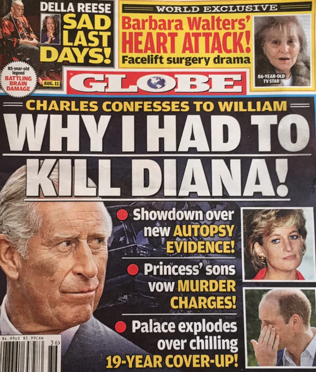 This sensational story in the Globe claimed that Prince Charles had confessed to the murder of his ex-wife. The two-page article inside carried no official comment and quoted only an unnamed “palace insider.”