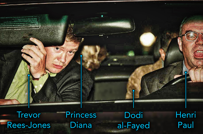 The car ricocheted, hurtling across the drive and spinning around before coming to a full stop, reduced to a mass of crushed steel. The front end telescoped into the engine, which in turn plowed through the driver's seat. Inside, Henri Paul and Dodi al-Fayed were killed instantly, their bodies hideously mangled. Trevor Rees-Jones was seriously injured. And Diana, Princess of Wales, was suddenly on the edge of death. It was 12:24 AM.