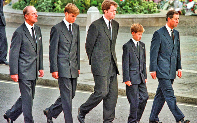 The princes William and Harry with (L to R) their grandfather, Prince Philip, their uncle, Earl Spencer, and their father, Prince Charles, in the funeral cortege.