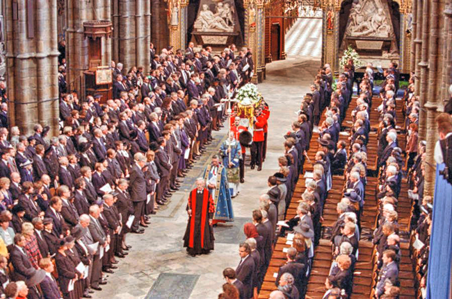 Crowds of people lined the two-mile long route Diana's funeral procession took through central London. After passing down the Mall, the procession travelled through Horse Guards Arch, along Whitehall, and finally to historic Westminster Abbey for the funeral service.