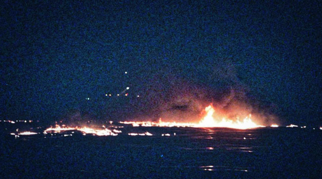 Burning wreckage from the crash on the water.