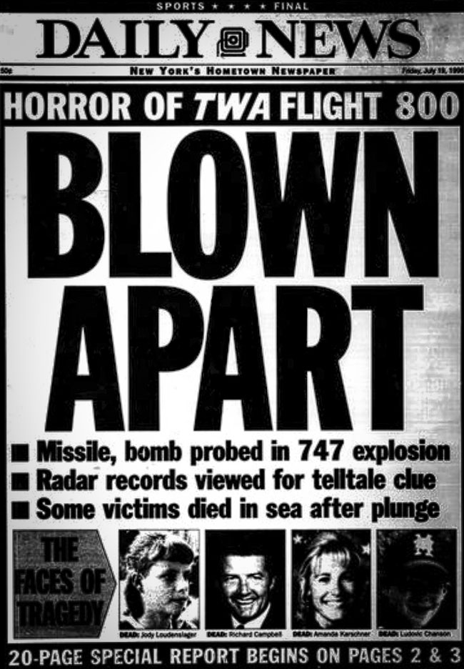 On the night of July 17, 1996 TWA Flight 800 exploded and crashed off the coast of Long Island, killing everyone on board. For months, investigators focused on three possible causes — a bomb, mechanical failure, or a terrorist missile. While the NTSB eventually concluded that the jet had exploded due to mechanical failure, as far as many people are concerned, what truly happened has not been publicly admitted to.