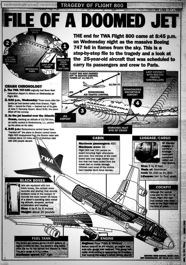 TWA flight 800 exploded and crashed into the Atlantic Ocean near East Moriches, New York, on July 17, 1996, just 12 minutes after takeoff from John F. Kennedy International Airport on a scheduled flight to Rome. All 230 people on board died.