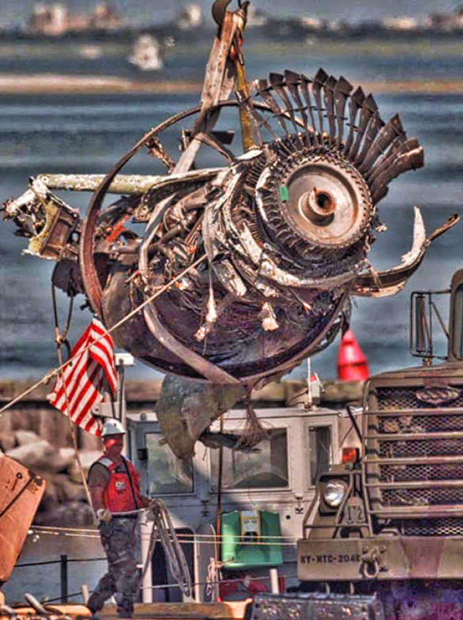 The final engine to be salvaged was loaded by crane onto a truck at the U.S. Coast Guard Shinnecock Station