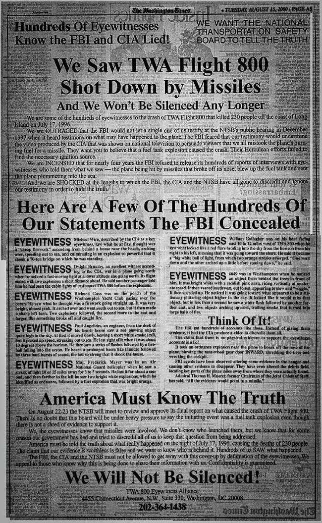 A month after the crash, The Washington Times carried a full page ad from the TWA 800 Eyewitness Alliance demanding that they be heard. The ad claimed that the FBI and NTSB had lied to the American public and that hundreds of people witnessed a missile shoot down of Flight 800. The ad concluded:
