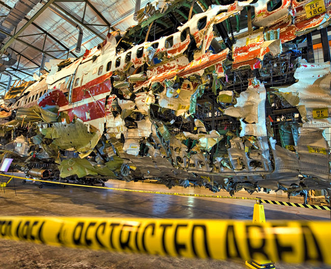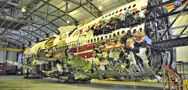 More than 95 percent of the aircraft was recovered during the investigation. It was also the NTSB’s biggest reconstruction project. Specialists reassembled 877 pieces into a ghost jet 94 feet long and 27 feet high. They formed the fuselage, the supporting wing structure and the center fuel tank.